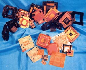 | 15 mil pitch, 188 lead, JEDEC Standard TAB test socket with 50 MHz high level D.U.T. tester. | 15 mil pitch, 188 lead, JEDEC Standard TAB test socket. |